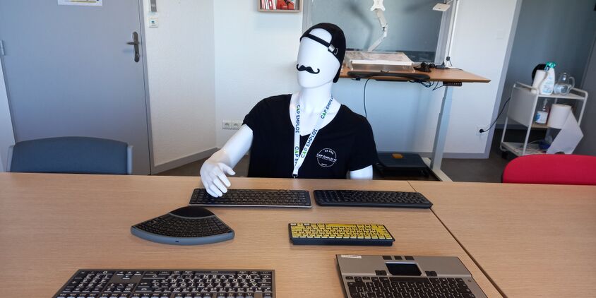 Aurélie, sa chargée de mission, lui présente une gamme de claviers adaptés à chaque situation : des touches grosses, contrastées, des modèles compacts, ergonomiques, rétroéclairés, et même des claviers pour écrire d'une seule main.